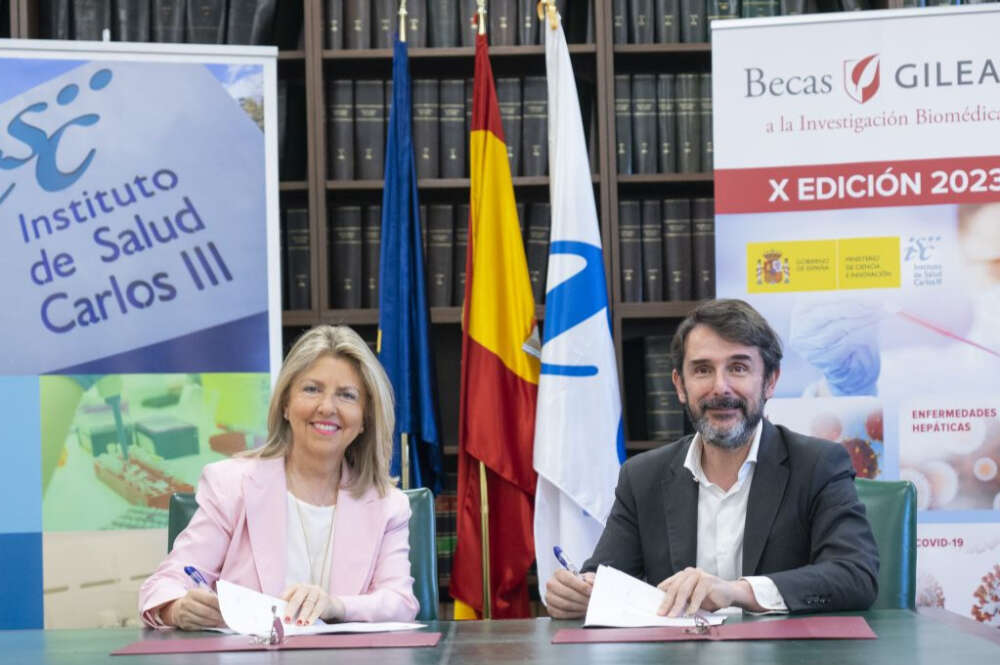 La vicepresidenta y directora general de Gilead España, María Río, y el director general del Instituto de Salud Carlos III (ISCIII), Cristóbal Belda, firmaron el convenio de colaboración para la convocatoria de la décima edición de las Becas Gilead a la Investigación Biomédica.