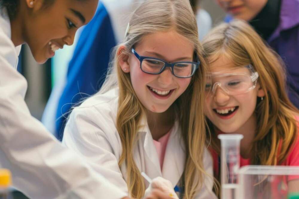 Tres niñas colaboran en un experimento químico en laboratorio | Foto de 123RF/iftikharalam