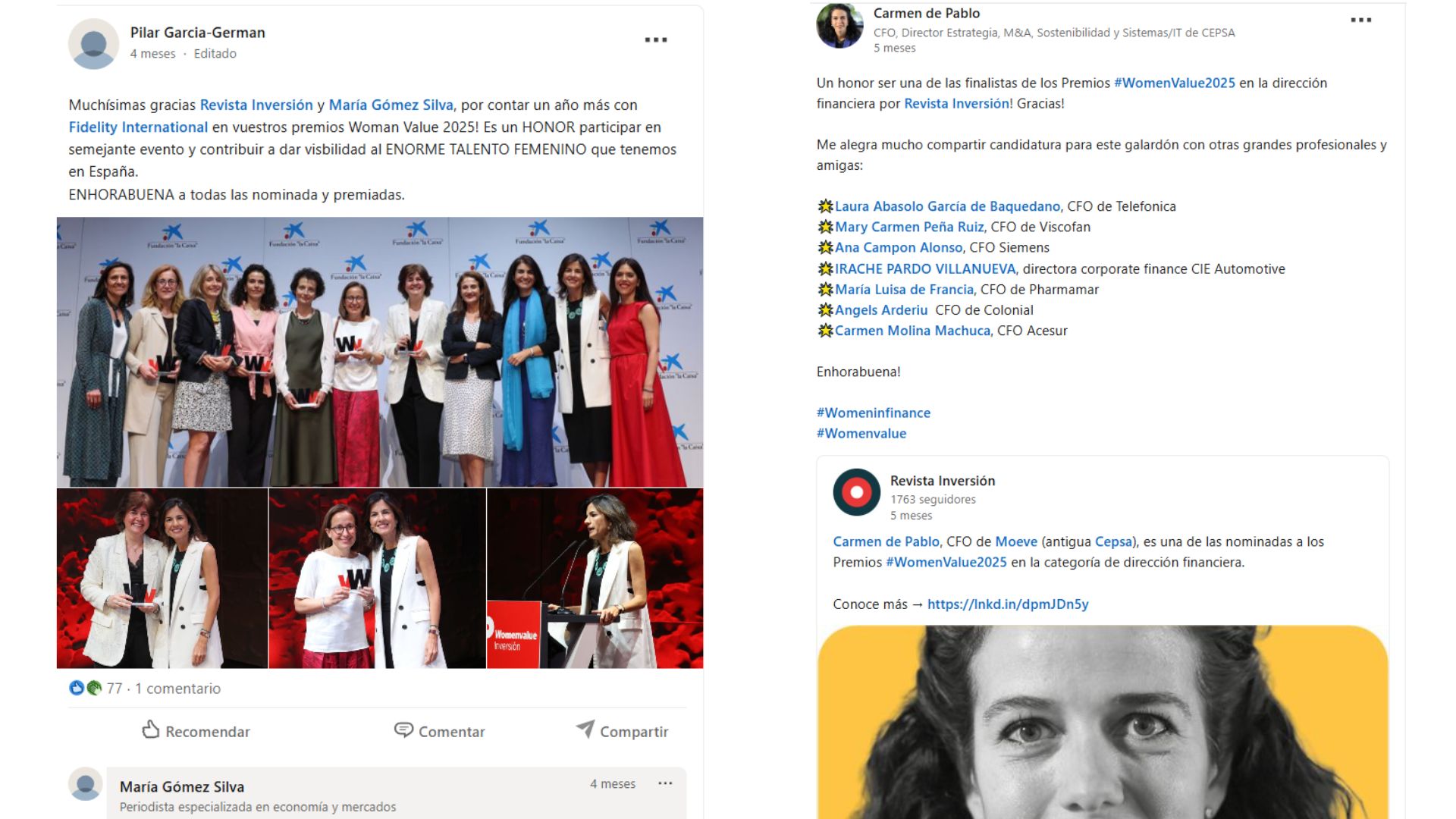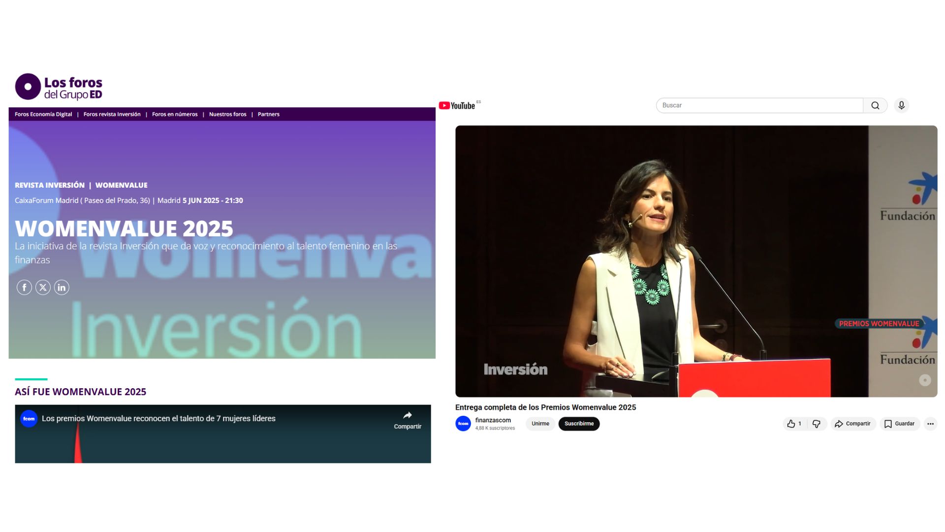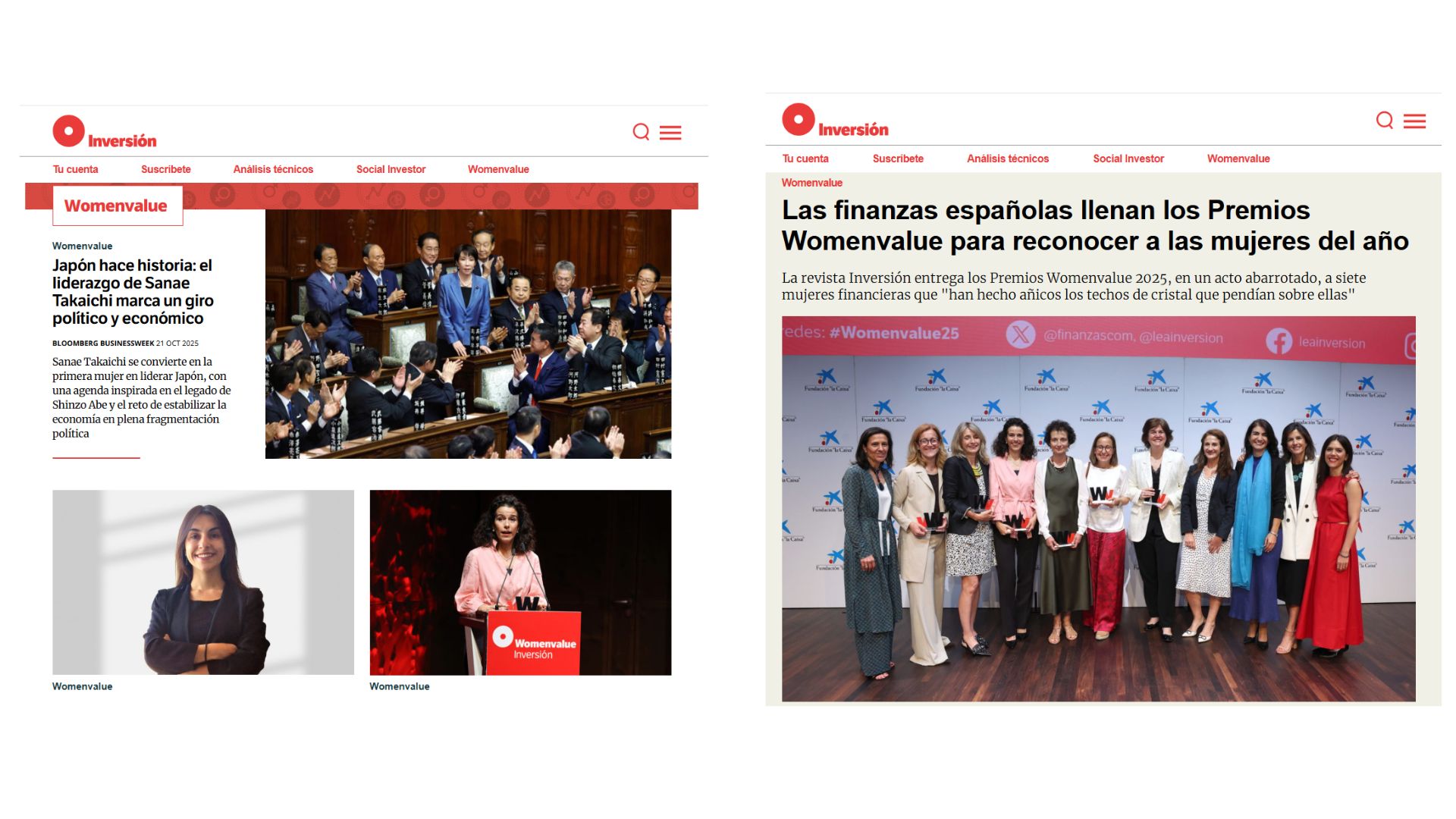 os Premios Womenvalue 2025 fueron una iniciativa de la revista Inversión con el apoyo del Grupo ED, con el objetivo de reconocer a mujeres líderes en el ámbito financiero y de los negocios que destacan por su trayectoria, impacto y compromiso con la transformación social. La premiación se estructuró en siete categorías —Sociedades de Inversión, Capital Riesgo, Economía, Investigación y Docencia, Fiscalidad, Finanzas Responsables y Dirección Financiera— y se celebró en un evento presencial en CaixaForum Madrid, donde se entregaron los galardones y se compartieron las historias de las premiadas. El principal reconocimiento fue la visibilidad: las mujeres galardonadas fueron protagonistas de entrevistas, artículos, vídeos y una amplia cobertura editorial y digital que amplificó su impacto.