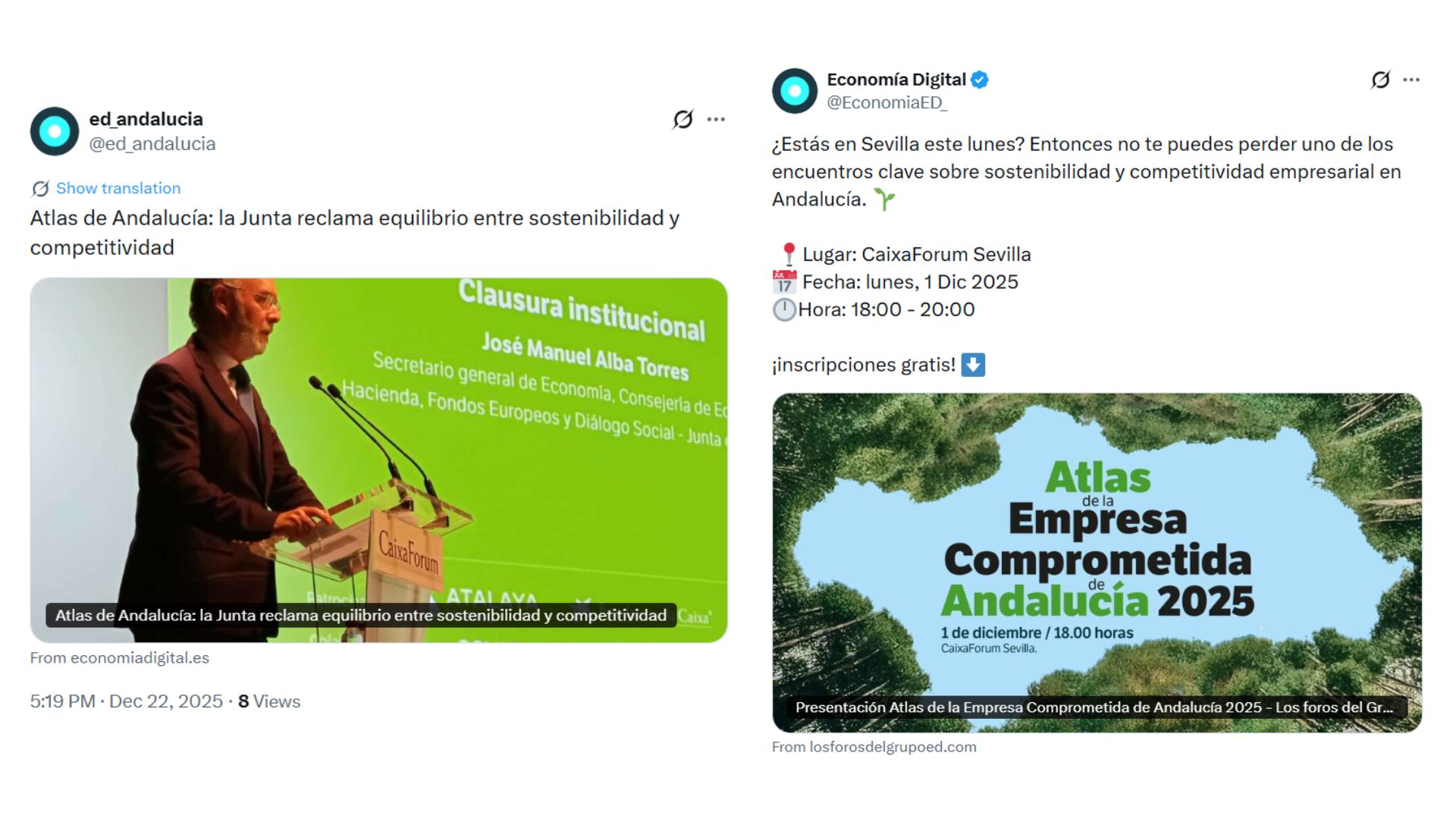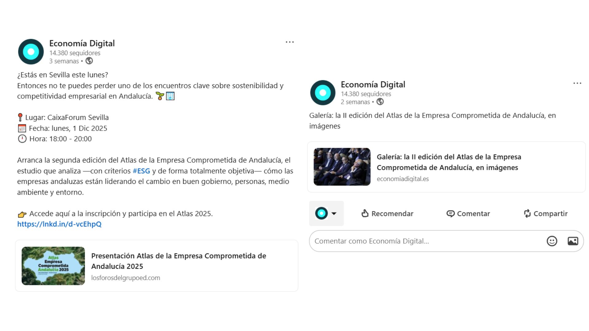 l Atlas de la Empresa Comprometida de Andalucía, organizado por Economía Digital con la colaboración de Mercados 21, celebra su segunda edición, cuya presentación oficial se llevó a cabo el 1 de diciembre de 2025 a las 18:00 h en el Espacio CaixaForum de Sevilla, consolidándose como un referente para medir la evolución del compromiso ESG (medio ambiente, aspectos sociales y buen gobierno) de las empresas andaluzas. Este informe proporciona una visión comparativa que permite identificar avances, retrocesos y buenas prácticas, apoyando a las compañías en su adaptación a los estándares europeos de sostenibilidad.