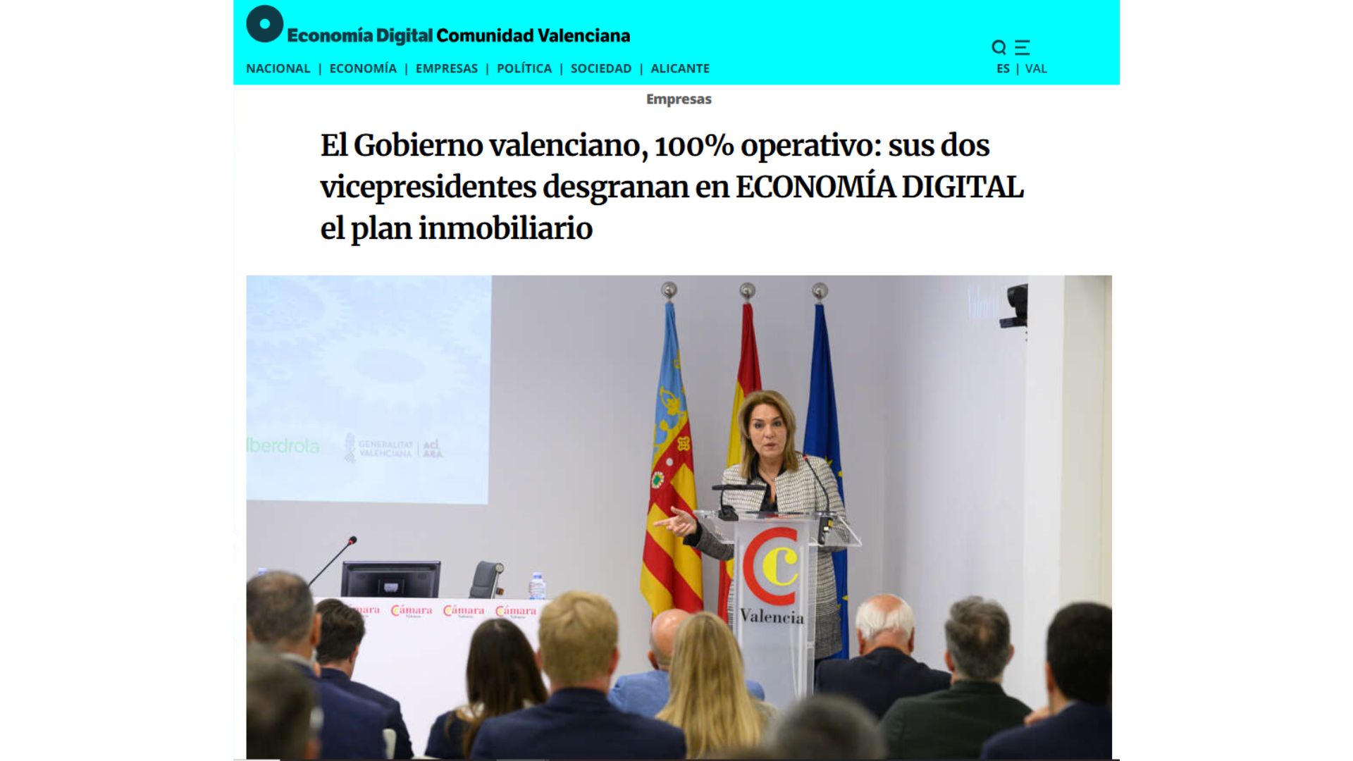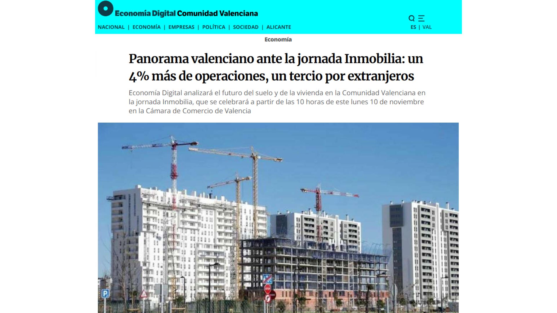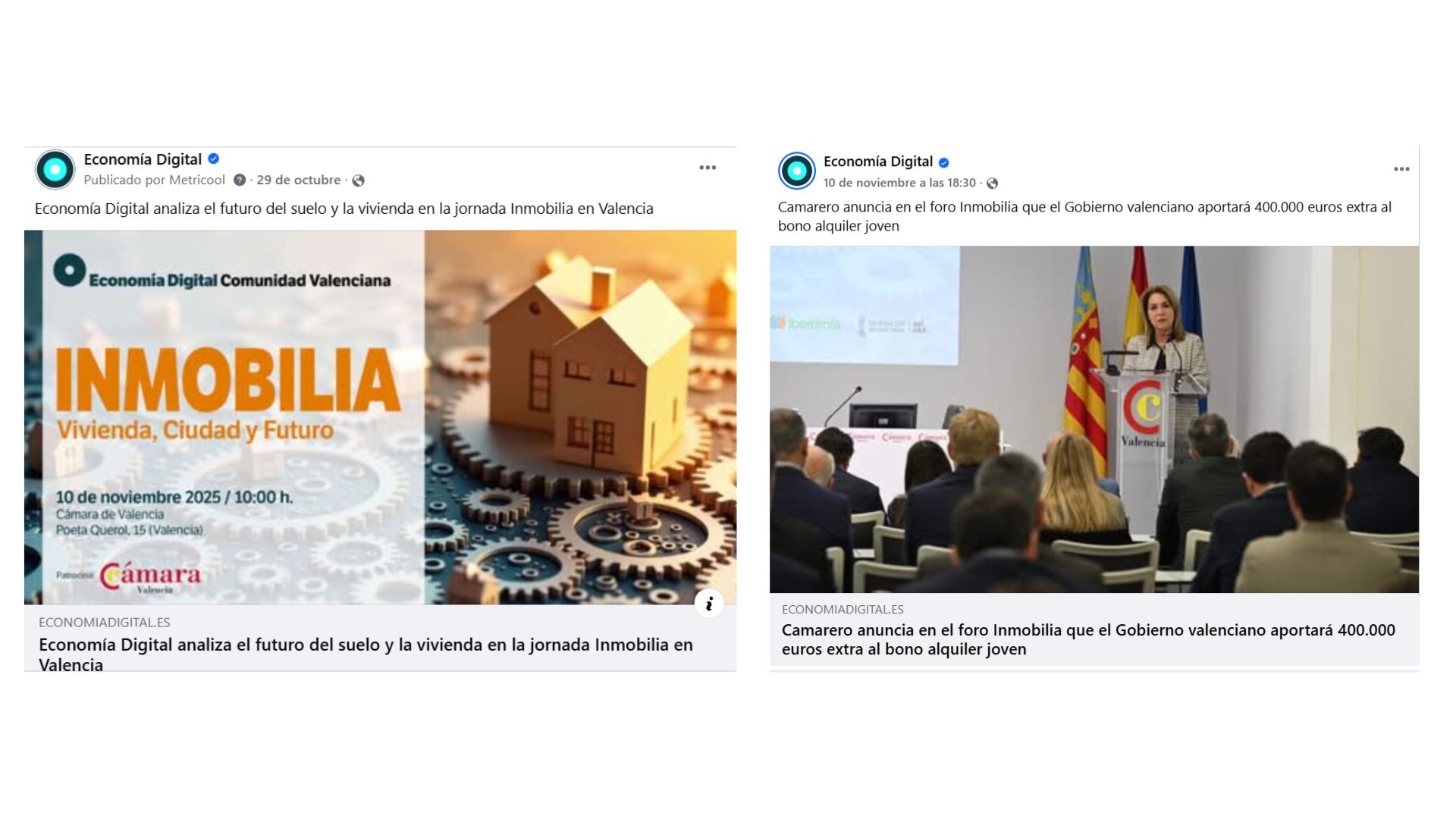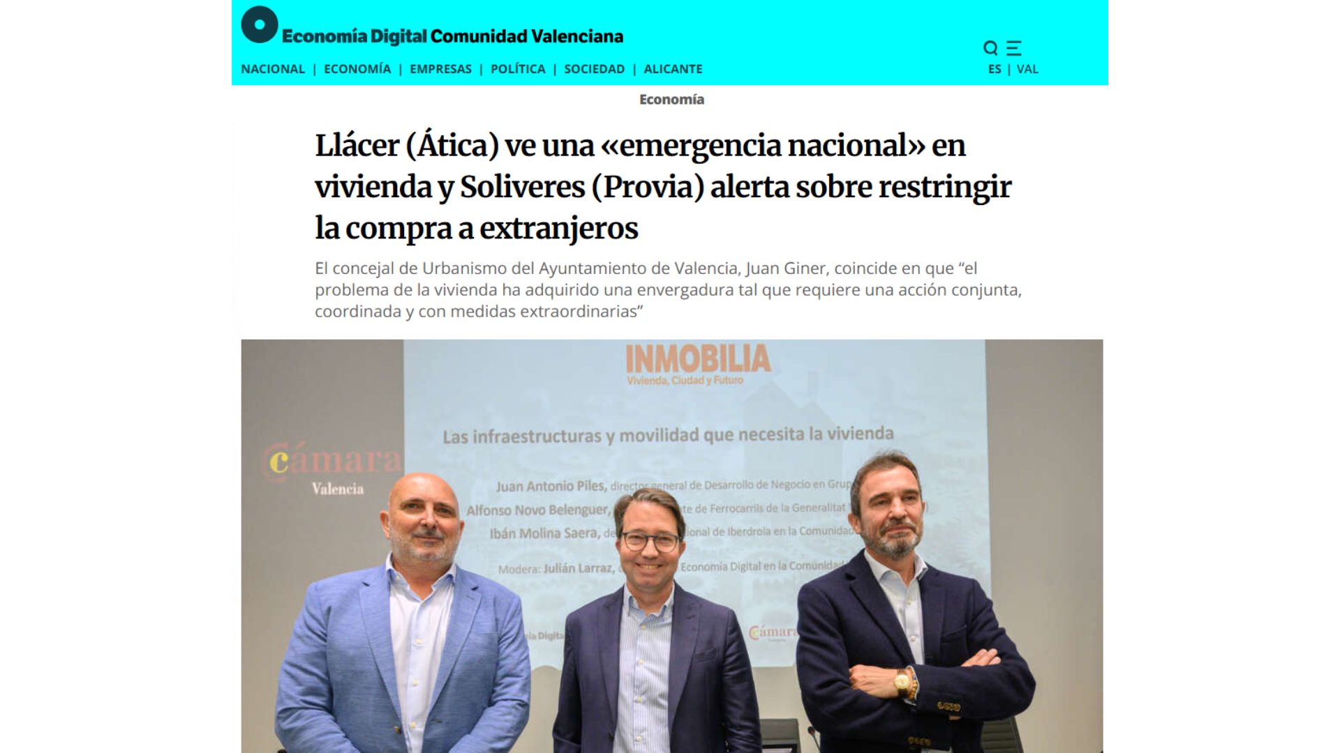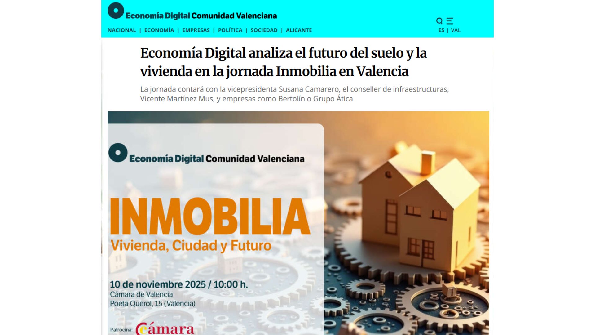 conomía Digital, junto a la Cámara de Comercio de Valencia, organizó la jornada Inmobilia el pasado 10 de noviembre en la sede de la Cámara de Valencia. El encuentro reunió a representantes institucionales y líderes del sector inmobiliario para debatir la futura ley del suelo, la agilización administrativa y las infraestructuras necesarias para responder a la creciente demanda habitacional.