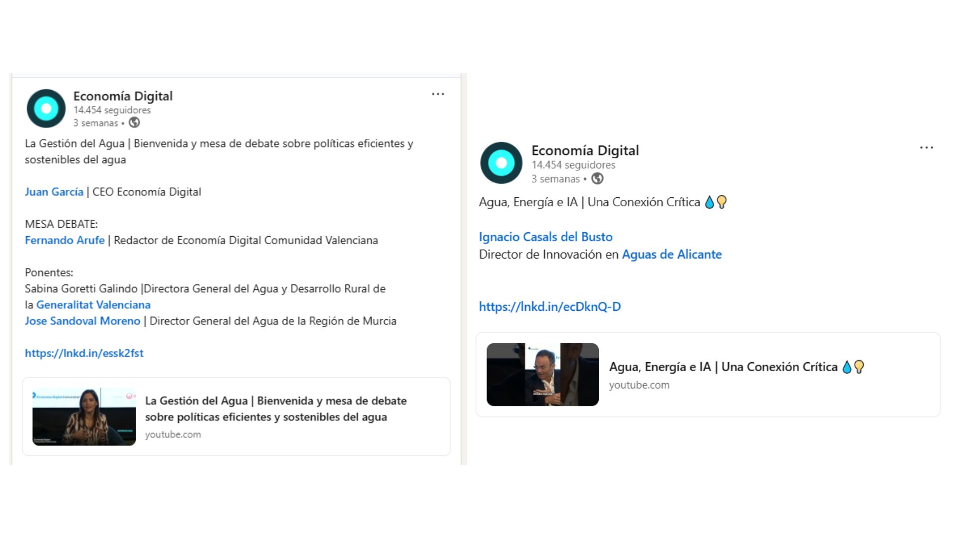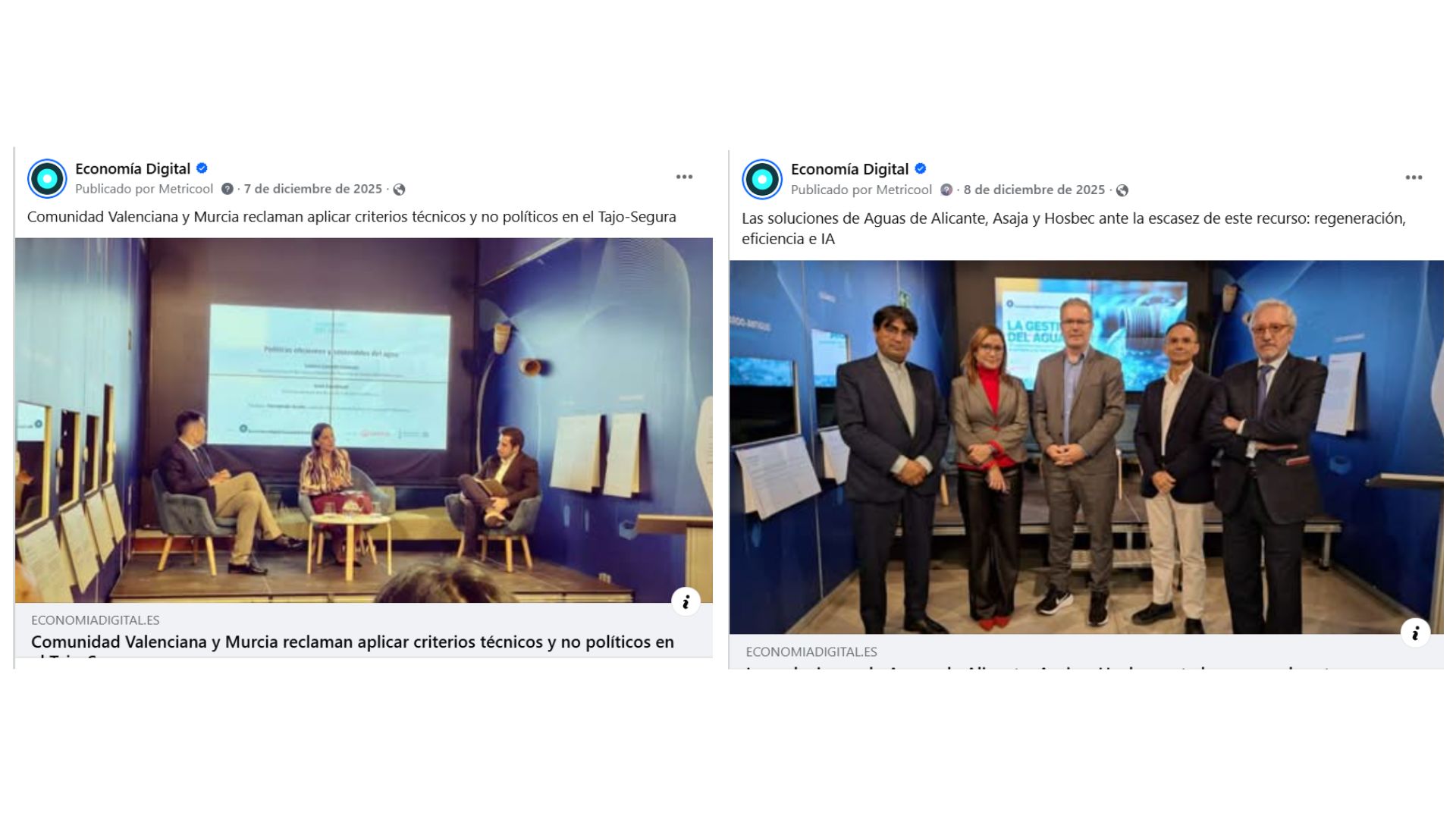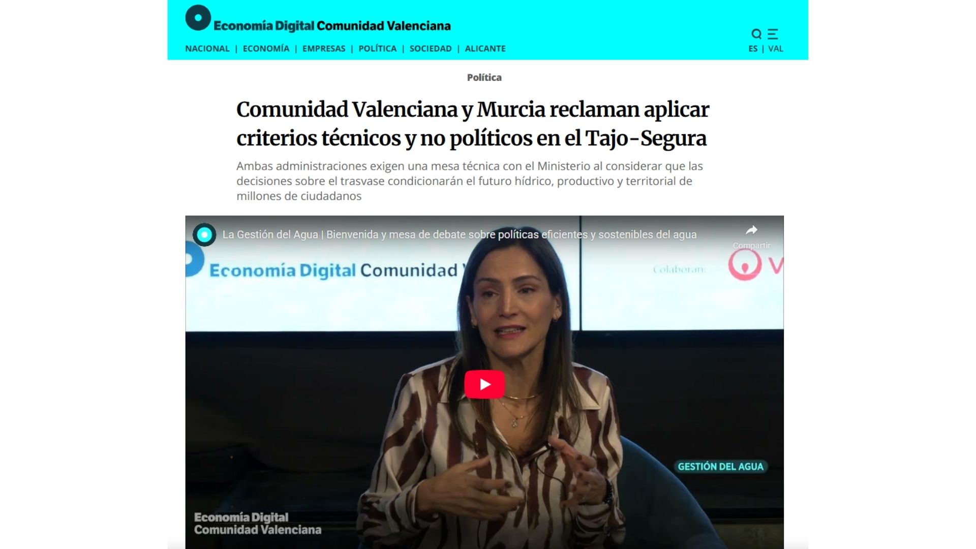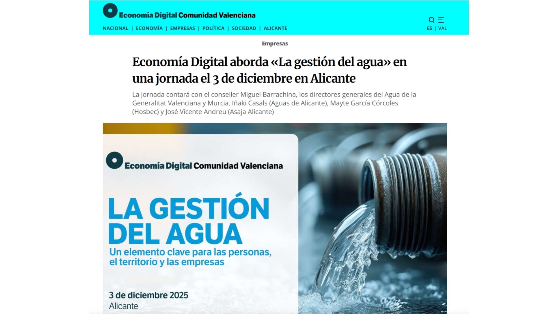 conomía Digital reunió en Alicante a representantes institucionales y del sector privado en la jornada “La gestión del agua”, celebrada el pasado 3 de diciembre, para analizar los principales retos y oportunidades en torno a un recurso estratégico para el territorio. El encuentro abordó las políticas públicas, la innovación, la digitalización y la sostenibilidad como ejes clave para garantizar una gestión eficiente del agua en la Comunidad Valenciana y regiones colindantes, en un contexto marcado por el cambio climático y la necesidad de coordinación entre administraciones y empresas.