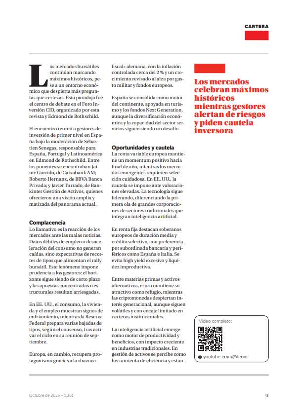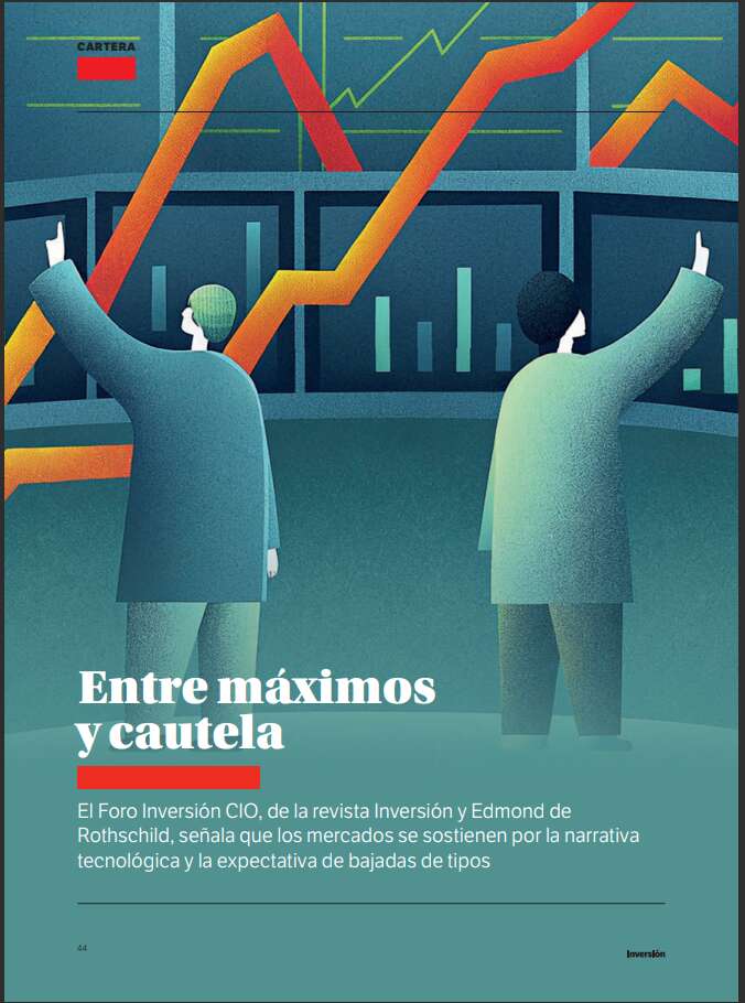l Foro CIO Otoño 2025, organizado por Inversión con el apoyo de Edmond de Rothschild Asset Management, analizó la paradoja de unos mercados en máximos pese a la incertidumbre económica y geopolítica. El rally se apoya en expectativas de bajadas de tipos y en la narrativa tecnológica, aunque se recomienda cautela y gestión activa. Europa muestra impulso fiscal y crecimiento revisado al alza, mientras EE. UU. da señales de enfriamiento.