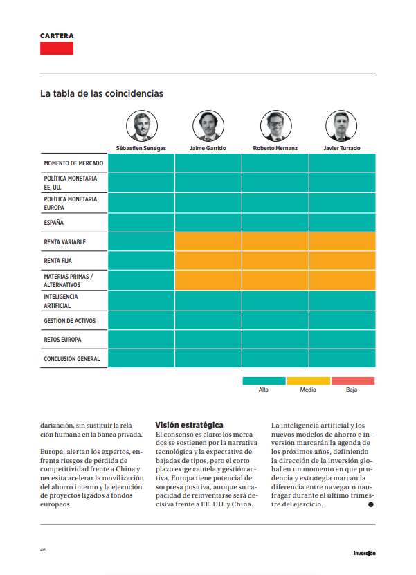 Las oportunidades se concentran en renta variable europea y deuda soberana, con riesgos en valoraciones elevadas y emergentes. La inteligencia artificial se perfila como motor de eficiencia, sin sustituir la relación humana. El consenso: prudencia, estrategia y adaptación tecnológica para navegar un entorno complejo.