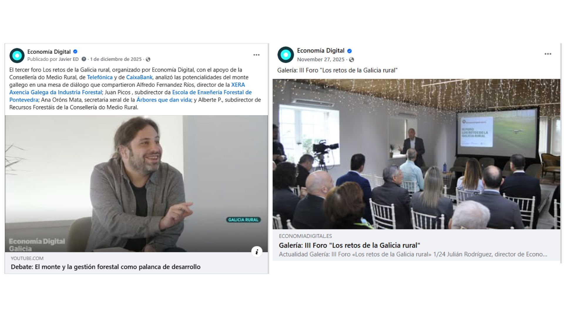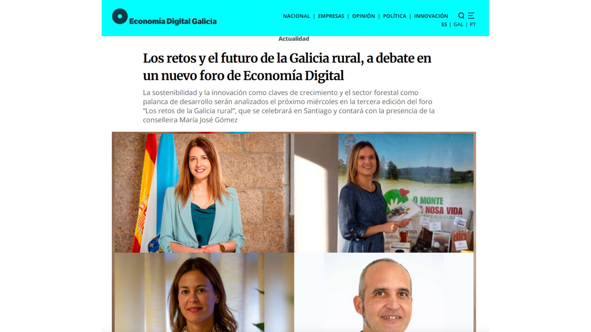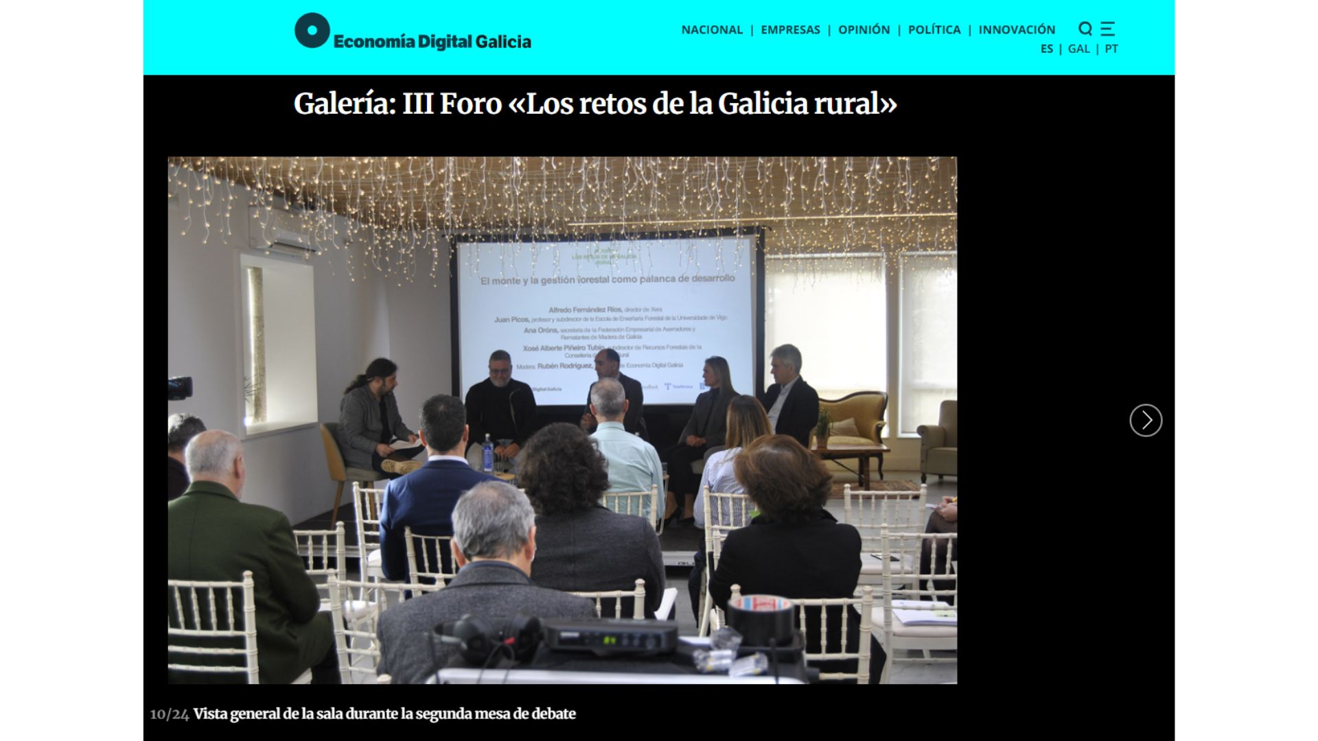 La tercera edición del foro “Los retos de la Galicia rural”, organizado por Economía Digital Galicia con la colaboración de la Consellería do Medio Rural, Telefónica y CaixaBank, tuvo lugar el pasado 26 de noviembre de 2025 en la Finca da Rocha, en Santiago de Compostela. Durante la jornada se reunieron referentes del ámbito académico, empresarial, forestal y de la administración autonómica, incluyendo a la conselleira María José Gómez. Los debates se centraron en cómo la innovación, la cadena de valor, la sostenibilidad y la gestión forestal pueden servir como motores esenciales para el desarrollo rural en Galicia.