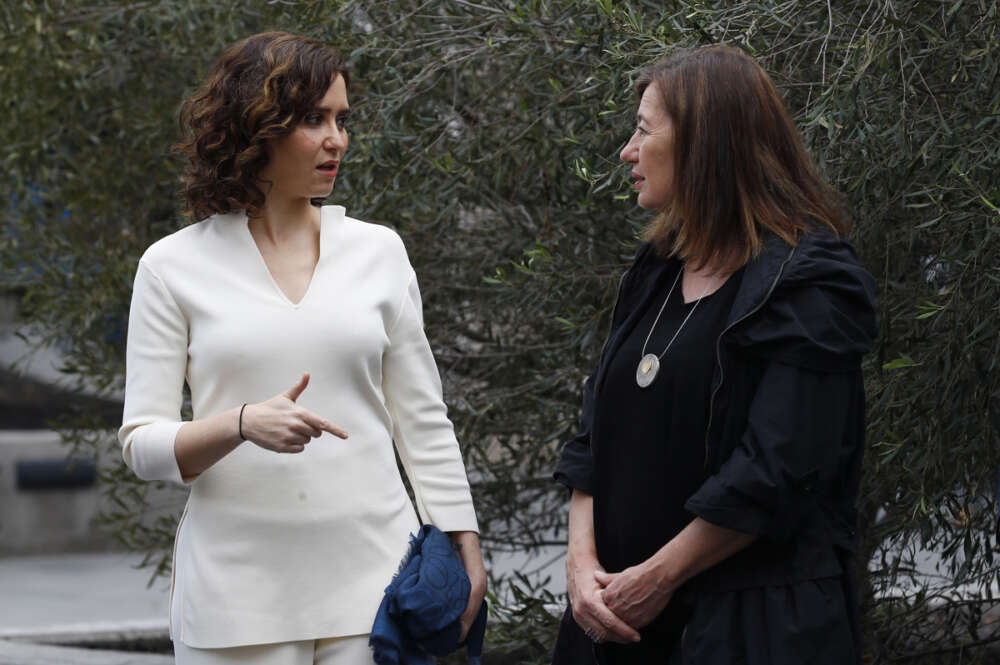 La presidenta de la Comunidad de Madrid, Isabel Díaz Ayuso conversa con la presidenta balear, Francina Armengol a su llegada a la XXVI Conferencia de Presidentes celebrada este domingo en el Museo Arqueológico Benahoarita en la localidad de Los Llanos de Aridane, al oeste de la isla de La Palma. EFE/Elvira Urquijo A.