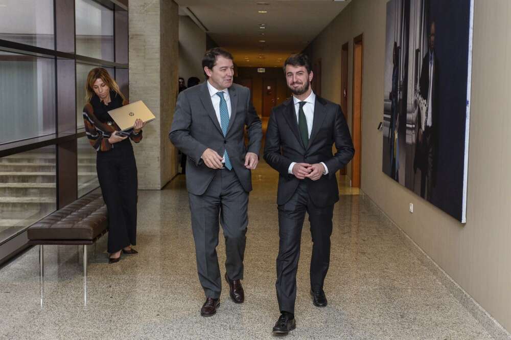 El presidente de la Junta de Castilla y León, Alfonso Fernández Mañueco (PP), conversa con el vicepresidente, Juan García Gallardo (Vox). Foto: EFE/ Nacho Gallego.