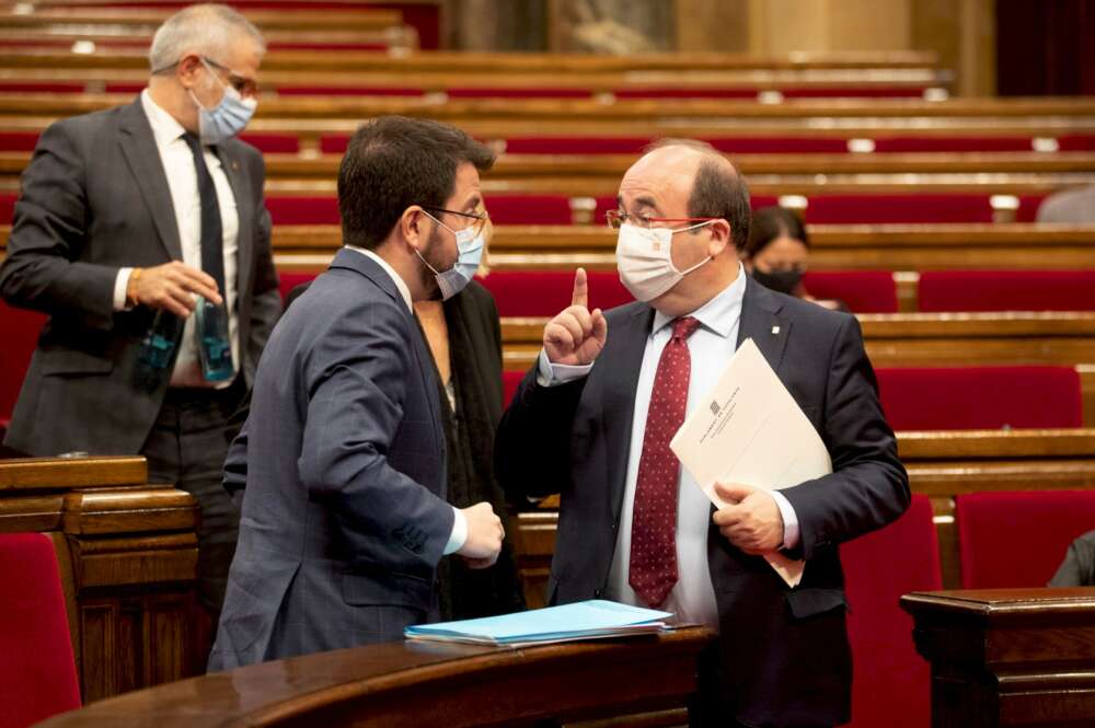 Los candidatos de ERC y PSC a las elecciones catalanas, Pere Aragonès y Miquel Iceta, en el Parlament | EFE/Archivo