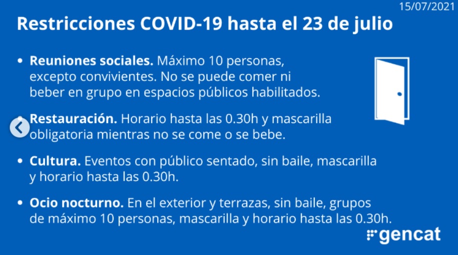 Además de la limitación nocturna -que se aplica en en los municipios de más de 5.000 habitantes con una incidencia superior a los 400 casos- entre las nuevas restricciones también se encuentra la limitación de las reuniones sociales a diez personas. Además, la hostelería, la cultura y el ocio nocturno solo podrán permanecer abiertos hasta las 00.30 horas.