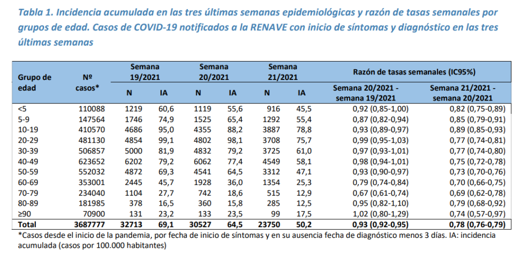 El último informe sobre la situación de la pandemia del Instituto Carlos III muestra cómo la incidencia acumulada se concentra ahora en los grupos demográficos que aún no han podido acceder a las vacunas. En la franja de edad de las personas de entre 80 y 89 años, que ya han completado su inmunización en todo el país, el ritmo de contagios es de 12,5 casos por cada 100.000 habitantes. Mientras que en los jóvenes de 10 a 19 años la cifra se dispara hasta los 78,8 puntos.