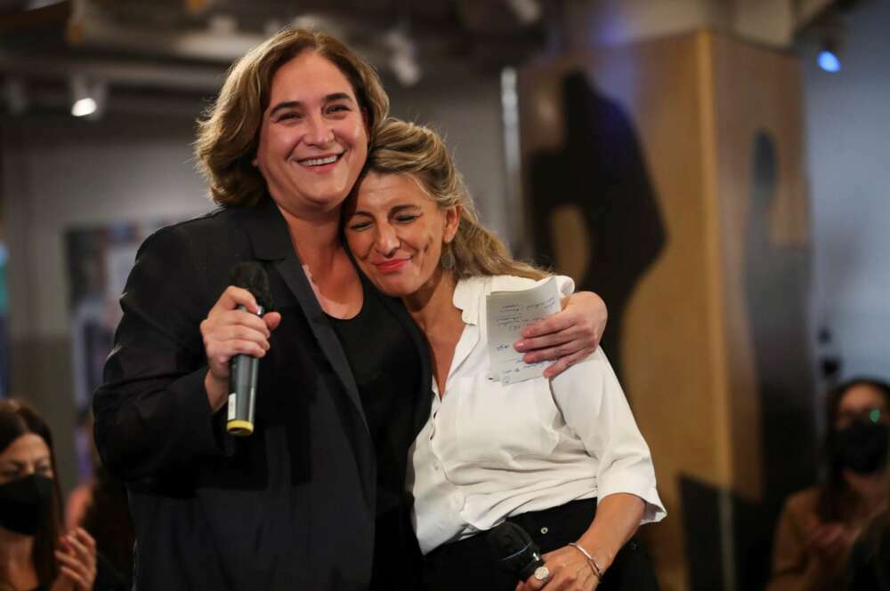 GRAF3136. MADRID (ESPAÑA), 01/10/2021.- La vicepresidenta segunda del Gobierno, Yolanda Díaz (d), y la alcaldesa de Barcelona, Ada Colau (i), participan en el seminario «El feminismo de la cuarta Ola» en el Espacio Bertlsmann, este viernes en Madrid. EFE/David Fernández
