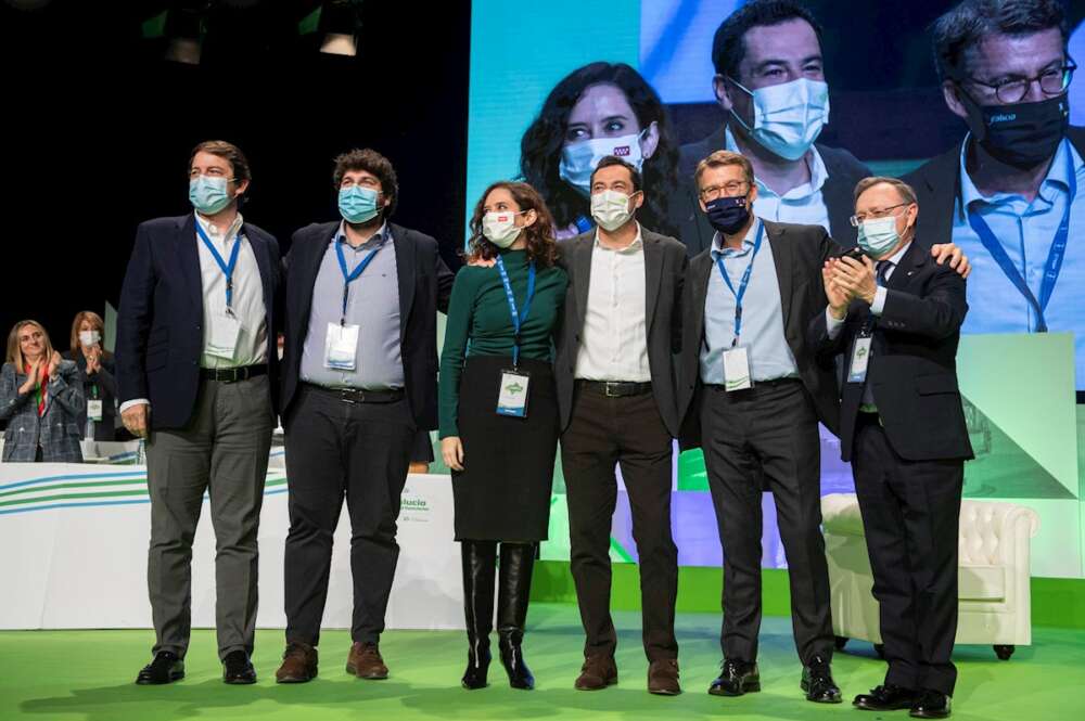 López Miras junto a Juan Manuel Moreno Bonilla, Alfonso Fernández Mañueco, Isabel Díaz Ayuso, Alberto Nuñez Feijóo y Juan Jesús Vivas, en el Congreso del PP-A. Foto: EFE