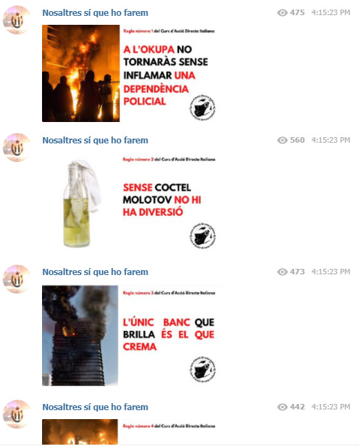 En principio usando como inspiración lo aprendido en ese «curso», los grupos de Telegram han propagado imágenes con leyendas como «al okupa no volverás sin incendiar una dependencia policial» o «sin cóctel molotov no hay diversión«. (El pasado fin de semana se lanzaron cócteles molotov y se intentó quemar una furgoneta de la Guardia Urbana).