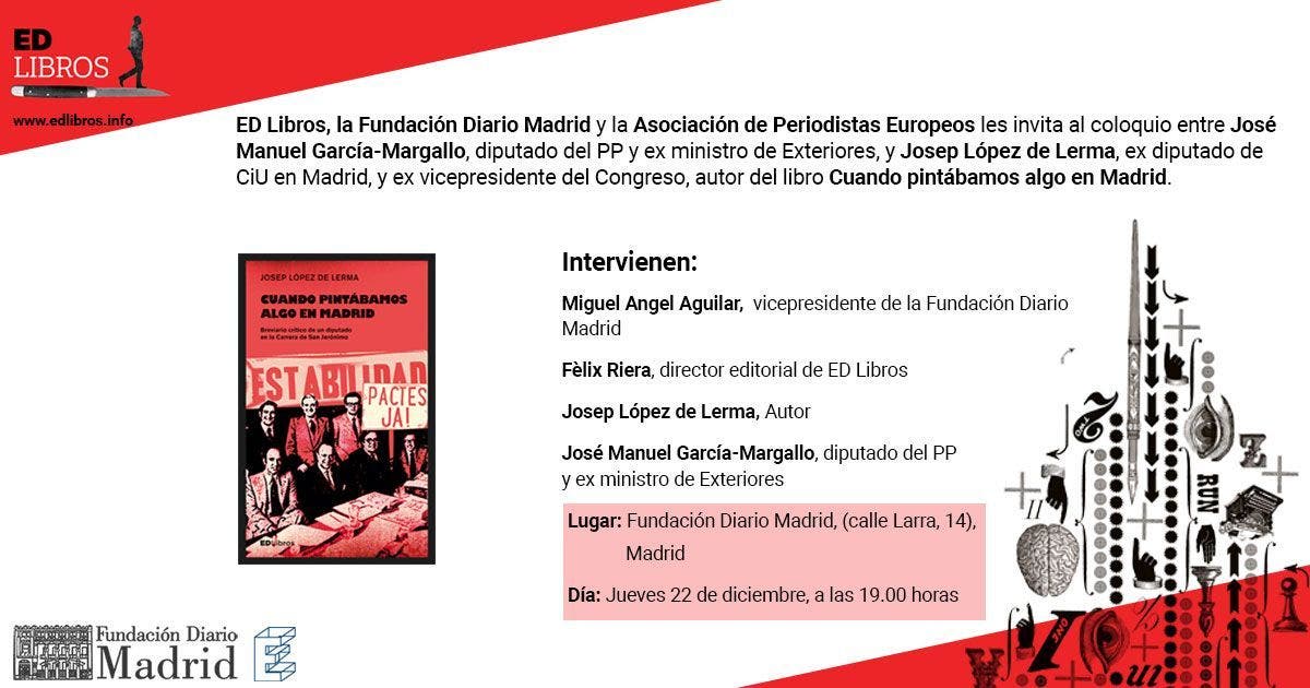 Margallo y López de Lerma debatirán a partir del libro Cuando pintábamos algo en Madrid, del exdiputado de CiU y ex vicepresidente del Gongreso. López de Lerma analiza el papel que tuvo el catalanismo político desde la recuperación de la democracia, y considera que aquella experiencia tuvo un sentido para «el aumento del autogobierno en Cataluña, pero también para garantizar la estabilidad del Estado».