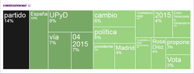 Rosa Díez y UPyD han motivado el 11% de las conversaciones. El 6% asocia a Rivera con el «cambio» mientras que el 3% de los tuits y posts en Facebook se centraron en la propuesta de frenar la expansión del AVE para derivar recursos a la I D i.