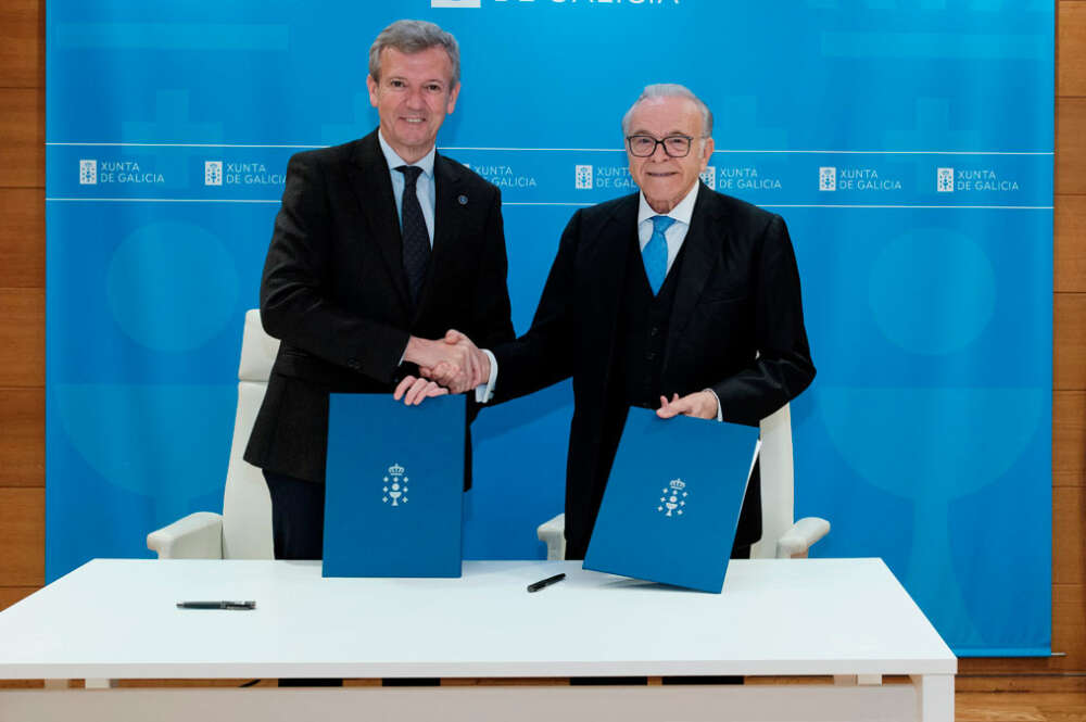 O presidente da Xunta de Galiza, Alfonso Rueda, e o presidente da Fundação La Caixa, Isidro Fainé, na assinatura do acordo quadro – XAIME CORTIZO