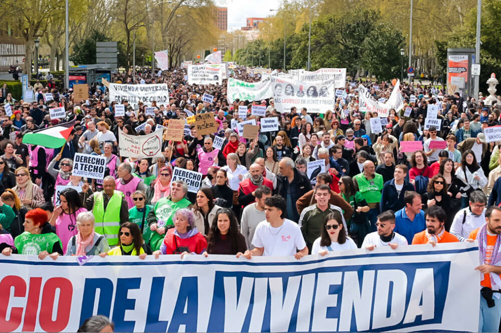 Milhares de pessoas durante uma manifestação pela habitação, desde Atocha, 5 de abril de 2025, em Madrid (Espanha). Mateo Lanzuela / Europa Press