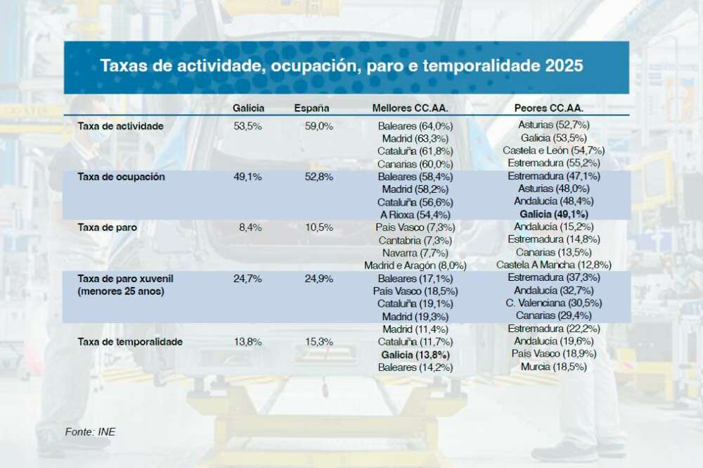 A taxa de ocupação na comunidade durante 2025, explica o informe, situou-se em 49,1%, “reduzindo o diferencial com respeito à média estatal que se situa em 3,7 pontos frente aos 3,9 do ano anterior”. Com este dado, Galiza figura como a quarta comunidade com menor taxa de emprego, à frente de Extremadura (47,1%), Astúrias (48%) e Andaluzia (48,4%).