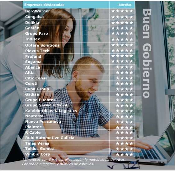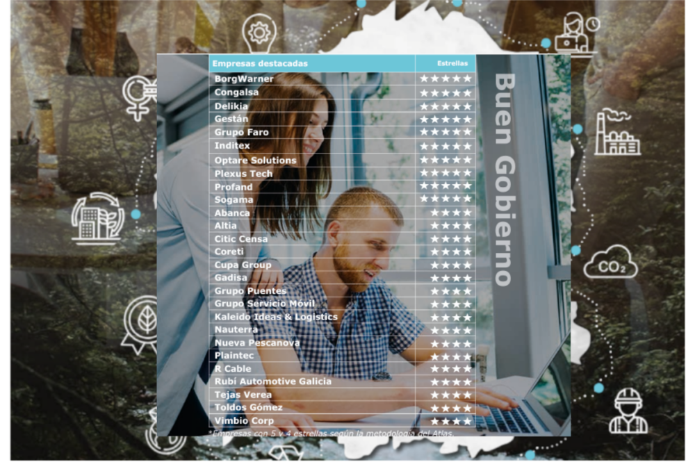 Nesta linha, as empresas que alcançam a pontuação máxima possível na variável Ética no Atlas Galego da Empresa Comprometida 2025 são Cetius, Citania, Congalsa, Delikia, Espina & Delfín, Grupo Gestán, Grupo Pontes, Grupo Serviço Móvel, Inditex, Lactalis Iberia, Northius, Profand, R Cable e Vimbio Corp.
