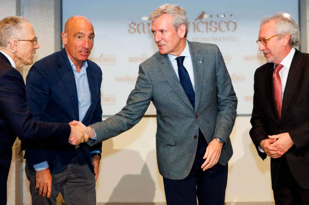 Fernando de Bunes, diretor de Sustentabilidade da Inditex, cumprimenta Alfonso Rueda na presença de Julián Rodriguez (i), diretor de Economia Digital Galiza, e Juan García, editor de Economia Digital. Xunta