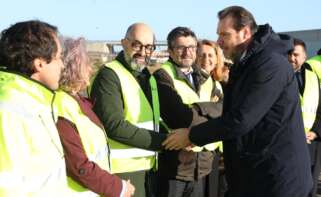 (Foto de ARQUIVO) O ministro dos Transportes, Óscar Puente, dá a mão ao presidente da Adif, Luis Pedro Marco de la Peña, durante uma visita às obras para a construção do ramal ferroviário do acesso à doca de La Cabezuela-Puerto Real / Nacho Frade / Europa Press