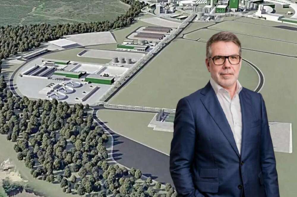 José Soares de Pina, CEO da Altri, com o projeto para a fábrica de fibras têxteis de Palas de Rei ao fundo