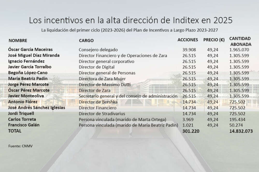 Esta liquidação do Plano de Incentivos a Longo Prazo deixou como beneficiários um total de 12 membros da alta direção da Inditex, com o diretor executivo (Óscar García Maceiras) à frente, bem como a Carlos Torreta e Francisco Galán, maridos de Marta Ortega e María Beatriz Padín, respectivamente.