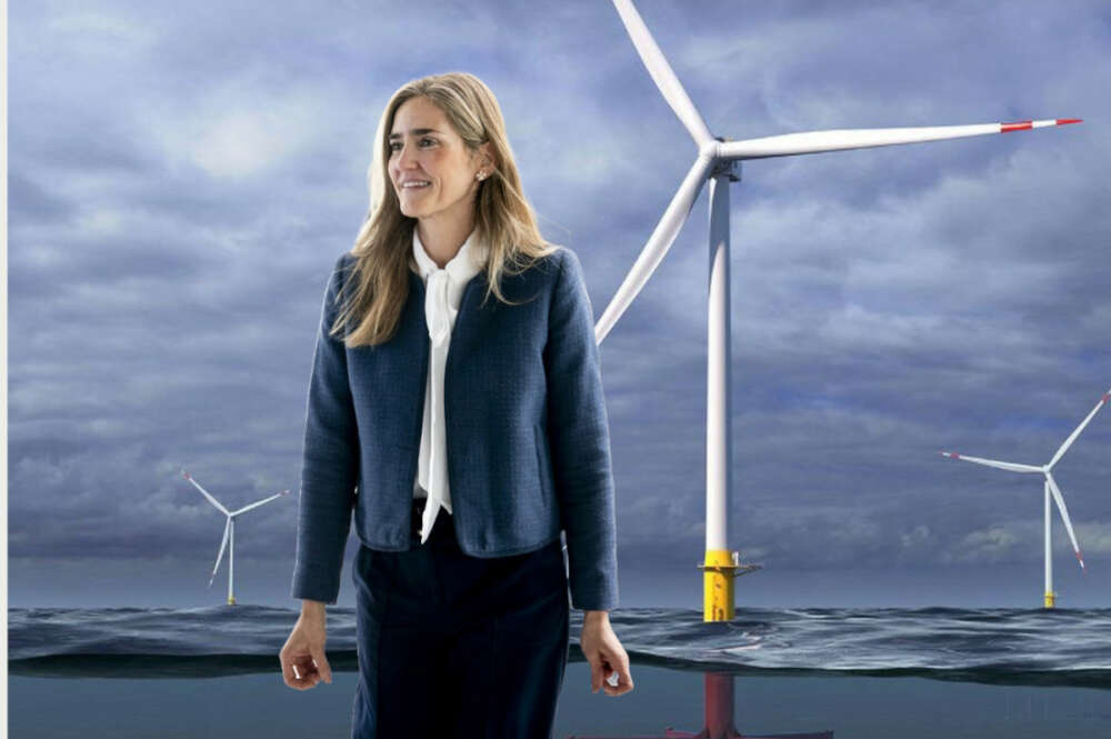 Montagem que mostra a ministra para a Transição Ecológica, Sara Aagesen, com um parque eólico marinho ao fundo