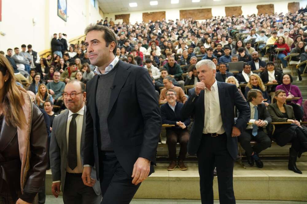 O ministro da Economia, Carlos Cuerpo, na faculdade de Economia da USC acompanhado pelo catedrático e diretor do Foro Económico da Galiza, Santiago Lago /Álvaro Ballesteros / Europa Press