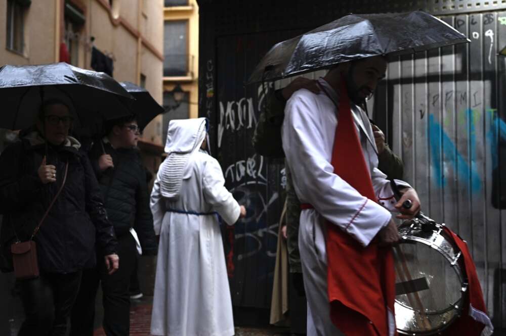 Unos cofrades resguardándose de la lluvia. Foto: Marcos Cebrián / Europa Press