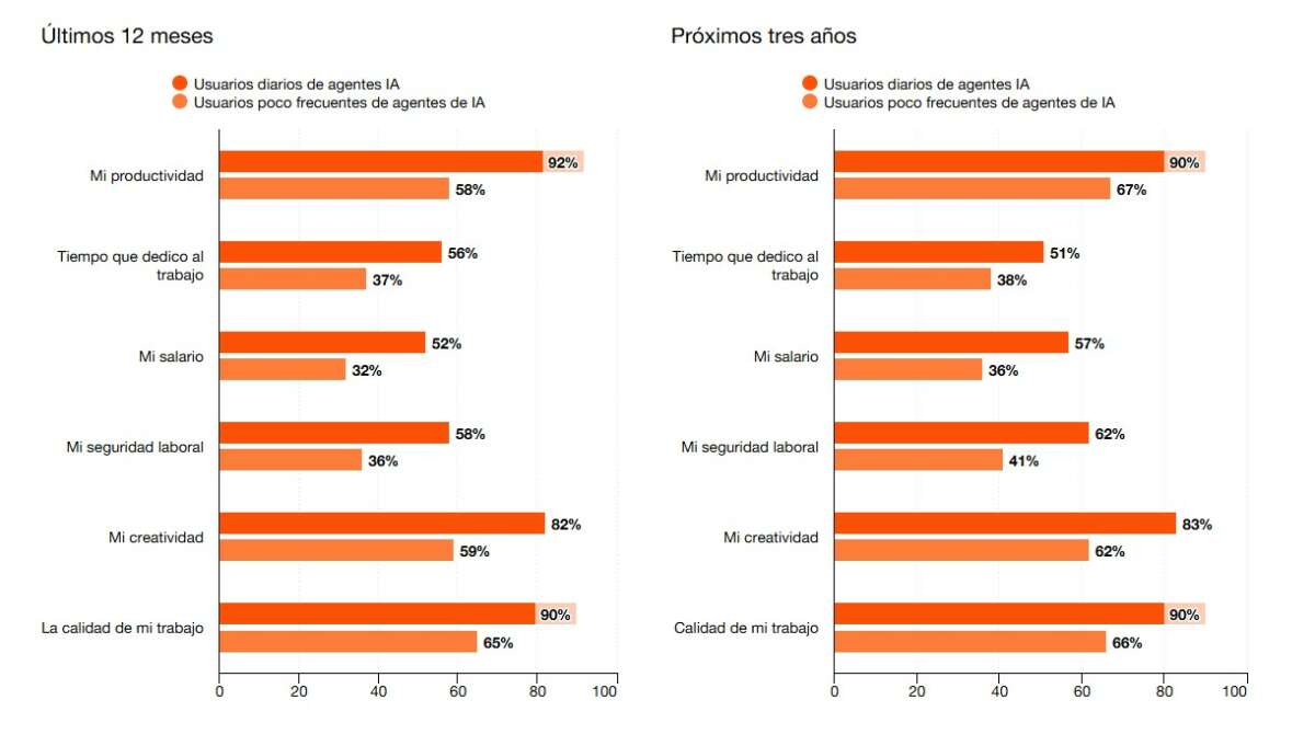 El estudio, realizado entre casi 50.000 trabajadores de 48 países, incluida España, revela que el 92% de los usuarios frecuentes de IA asegura haber mejorado su productividad, frente al 58% de los que la usan solo de forma ocasional. Además, más de la mitad (52%) de estos profesionales ha experimentado un aumento salarial, mientras que su percepción de seguridad laboral se eleva al mismo porcentaje.