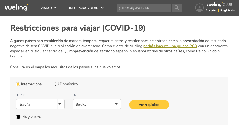Para dar respuesta a estas dudas Vueling ha puesto en marcha la web Restricciones para viajar Covid-19. Se trata de una herramienta online que informa en tiempo real de las restricciones y requisitos que existen para viajar a cada país en el momento en que se hace la consulta.