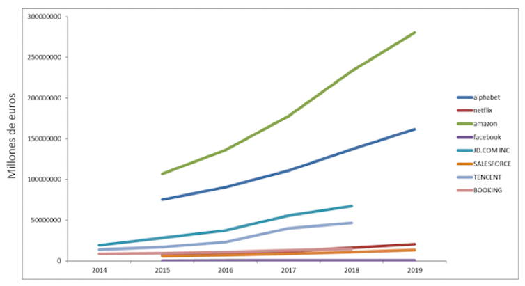 La neutralidad de red ha hecho que los grandes proveedores de contenidos (empresas mayoritariamente no europeas) hayan pasado a tener un peso mucho mayor que los proveedores de internet. Alphabet (Google), Amazon, Netflix y Facebook han pasado a liderar el ranking de las compañías más influyentes y fuertes de internet (ver Figura 2).