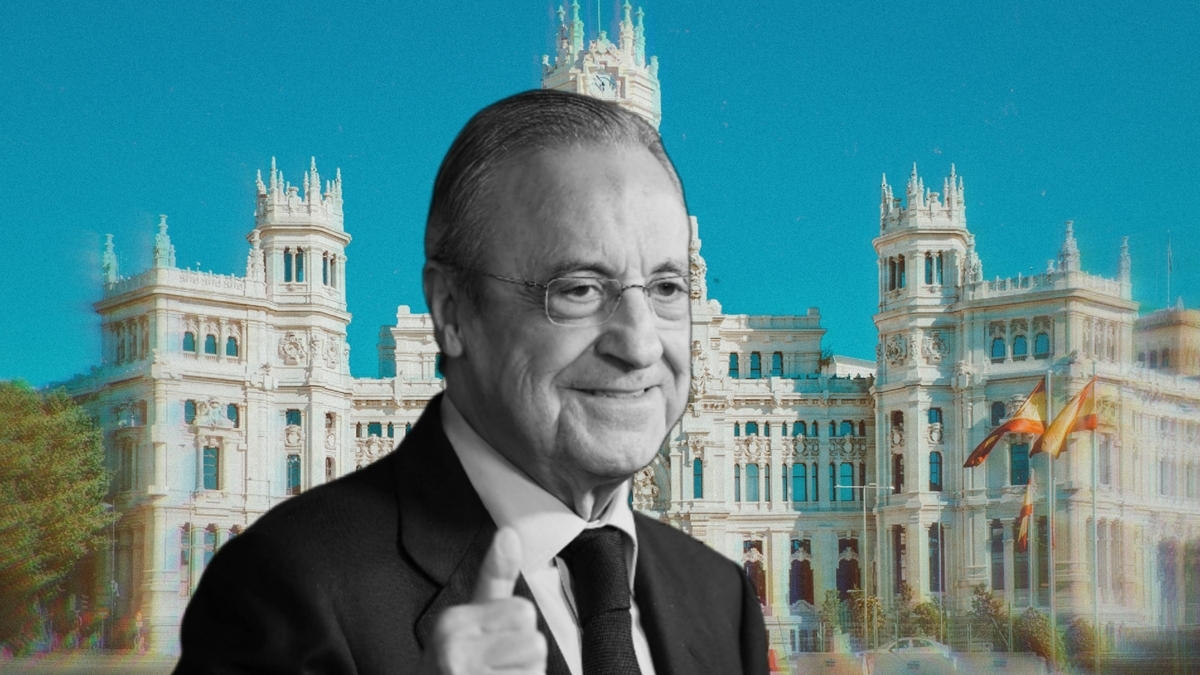 Florentino Pérez, en la Cibeles y debajo: Almeida adjudica el parking a ACS por 10 millones