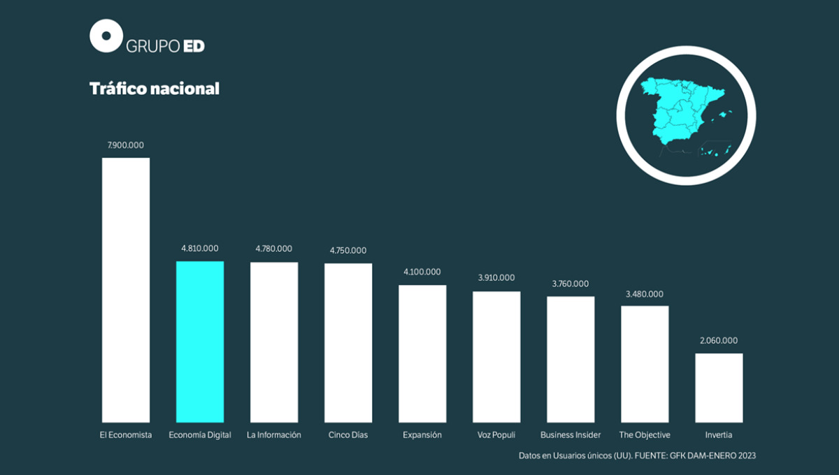 Economía Digital, con 4,8 millones de lectores en enero, logra superar en audiencia a La Información y acorta la distancia con el primer medio económico de España, El Economista. También obtiene mejores datos que Cinco Días, Expansión, Vozpopuli, The Objective e Invertia