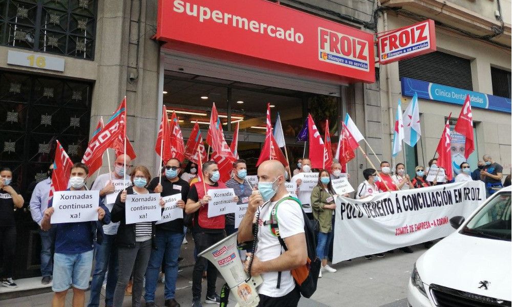 Trabajadores de A Coruña protestan para pedir que se mantengan las jornadas continuas implantadas durante el estado de alarma y que Froiz está eliminando