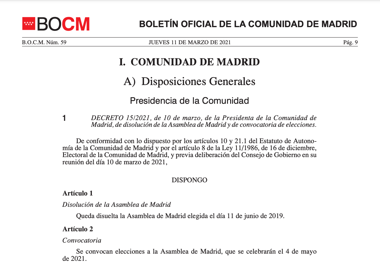Ayuso publica en el Boletín Oficial el decreto de convocatoria de las elecciones del 4-M