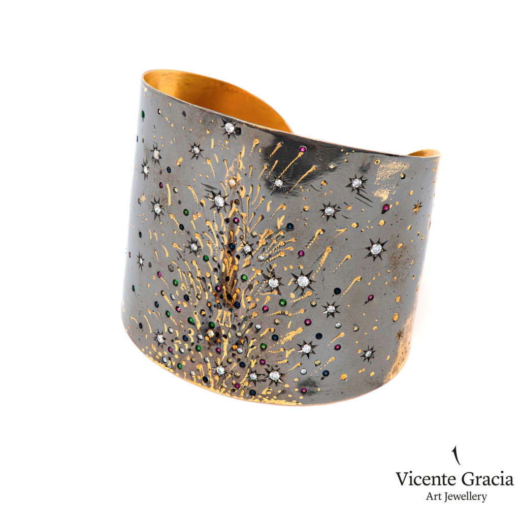 El diseñador Vicente Gracia ha logrado transformar la esencia de la Nit del Foc, el espectacular castillo de fuegos artificiales tradicional de Las Fallas, en una joya, en concreto un brazalete hecho de oro con brillantes y con piedras preciosas trabajado artesanalmente que es lo más parecido a llevar la más querida de las fiestas valencianas encima. Disponible en su tienda (Paz, 4. Bajo izquierda) y online.