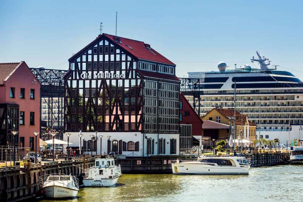 Este puerto del Báltico cuenta con varios edificios de madera llamados Fachwerk, con barras horizontales, verticales y diagonales de este material expuestas en las fachadas, donde los espacios intermedios son rellenados de arcilla o ladrillo.