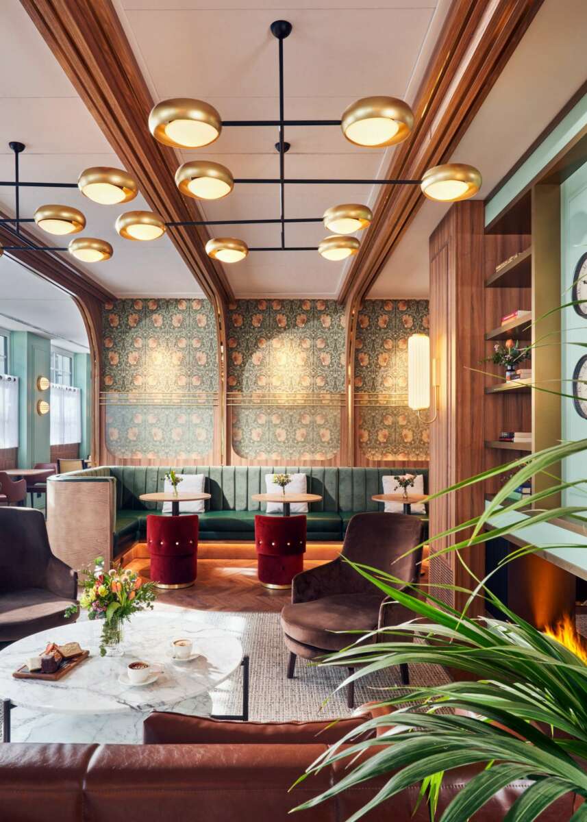 Tonos piedra para las paredes y materiales textiles en tonos marrones, beige y verdes contrastan con las molduras en blanco, los elementos metálicos en tono bronce y la madera de nogal, creando un conjunto cálido pese a las enormes dimensiones y aportando una mirada contemporánea y elegante que va más allá de la imitación de la estación original.