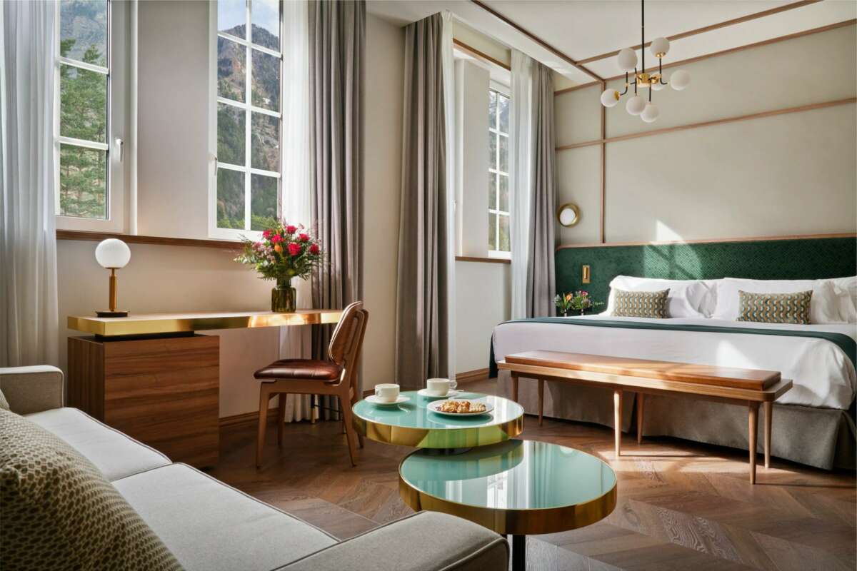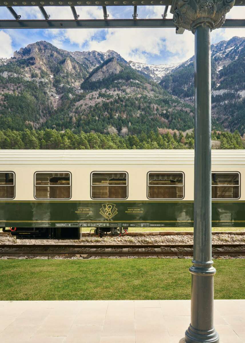 En la misma línea, las 104 habitaciones, todas con vistas al Pirineo aragonés y repartidas en dos plantas, combinan tonalidades cálidas y tejidos lujosos, como el terciopelo en los cabeceros, decorado con un estampado gráfico que emula los tapizados de los asientos de los vagones de los años 20.