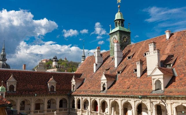 Igual las vistas no son tan privilegiadas como las de ese corredor, pero desde lo alto de colina se divisan las montañas de alrededor y un mar de tejados en el que hay que afinar la vista para distinguir una azotea acristalada de unos grandes almacenes. Una cívica transgresión de acero dentro del casco histórico, obra del arquitecto español Nieto Sobejano. En Graz lo antiguo y lo moderno conviven sin estridencias, como si un pincha discos de Ibiza crea su música sobre una suite de Bach.