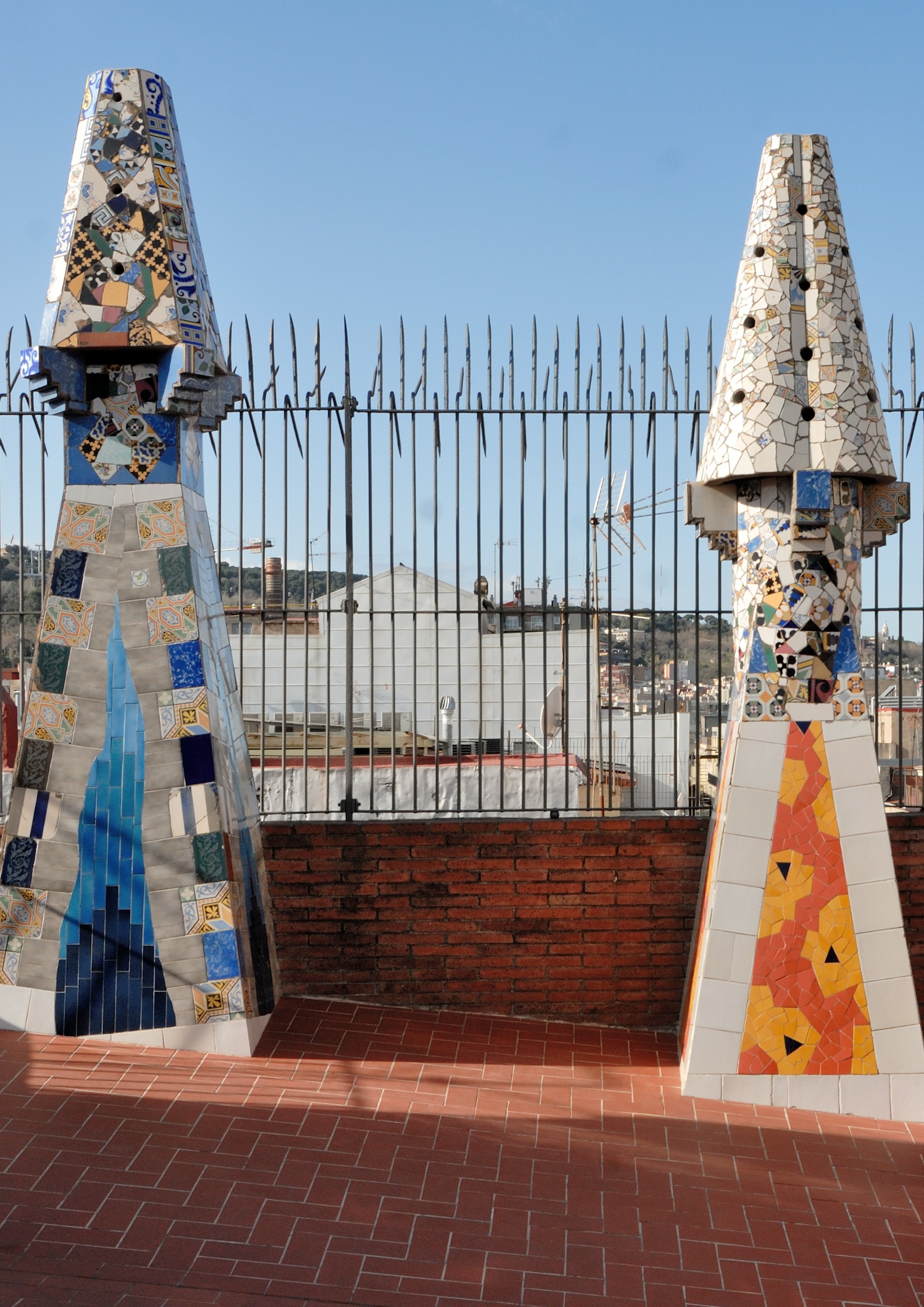 El trencadís de vibrantes colores que cubre muchas de las chimeneas es evidencia del que sería uno de los sellos de Gaudí en gran parte de su obra y que ha trascendido mucho más allá de su creación personal.