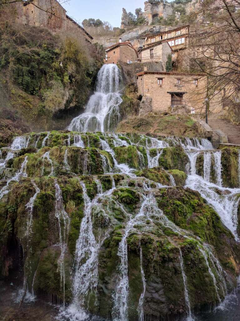De extraordinaria belleza, la cascada brota de la Cueva del Agua, atraviesa el caserío de piedra de la villa que cuelga de las terrazas de toba y se precipita en saltos de agua hacia el curso del Ebro, dando lugar a una serie de pozas de intenso azul turquesa.