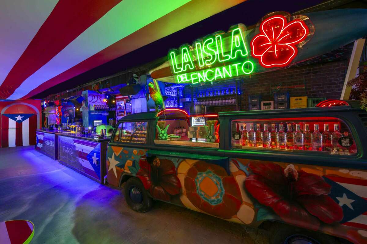 Un pasillo con mesas altas y ventanas que evocan las casas de colores de la isla permite llegar hasta el food truck de La Isla del Encanto y al espacio de DJ, cuya cabina se apoya en una mesa presidida por congos artesanales, un guiño directo al ritmo, el baile y la celebración constante de la cultura boricua.