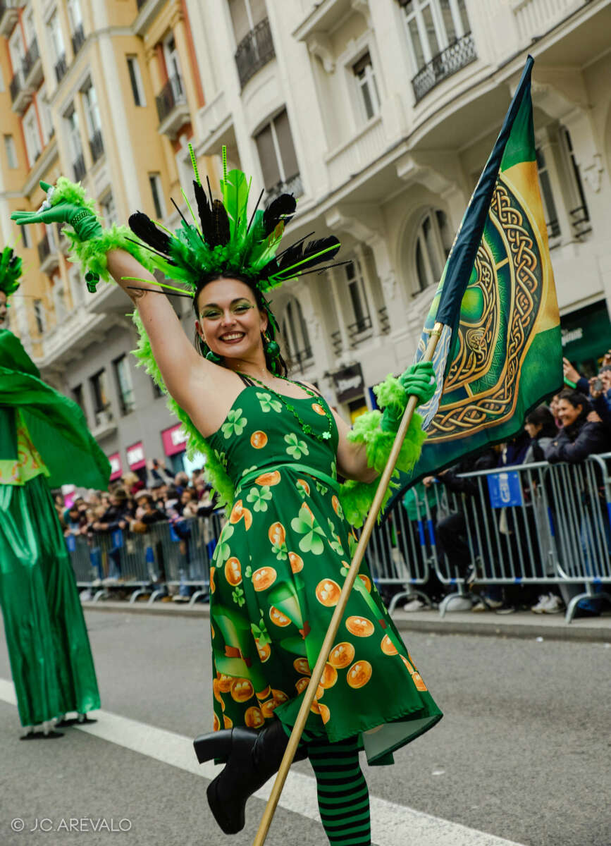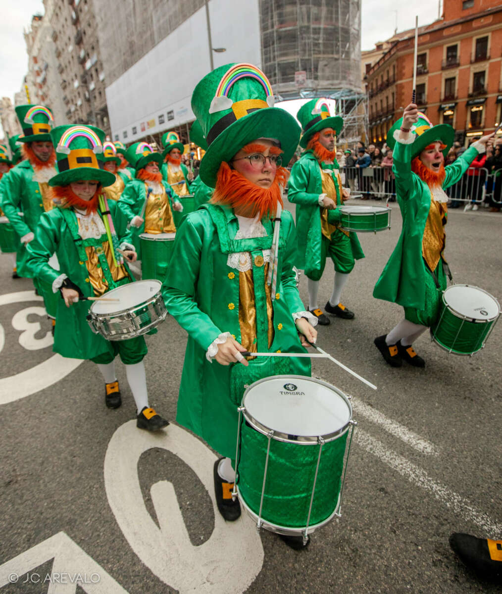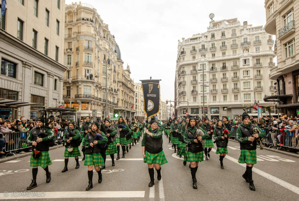 Por supuesto, también a Madrid, donde desde hace ya tres años San Patricio se extiende a toda una semana llena de gaiteros y conciertos, danza, deportes gaélicos, actividades culturales, monumentos iluminados de verde, mucha fiesta y, por supuesto, un desfile multitudinario -se esperan más de 700 gaiteros y 1200 participantes- que llena de verde la Gran Vía madrileña.