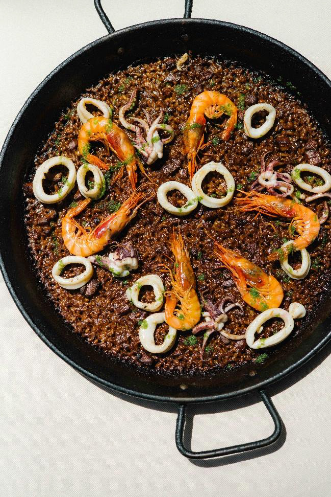 Pero como decíamos, aquí el arroz es protagonista, y se presenta en media docena de opciones, una más atractiva que la otra, como la paella marinera de calamar y gamba; el arroz negro con chipirón y alioli de azafrán; el de ternera con tuétano y pimientos del piquillo confitados; el meloso de pollo y cigalas, la fideuá de gambas y sepias; o la paella de verduras y brócoli en tempura. Y además de la citada paella de pulpo a la brasa, también hay que poner bajo el radar al arroz de navajas y alcachofas al carbón.