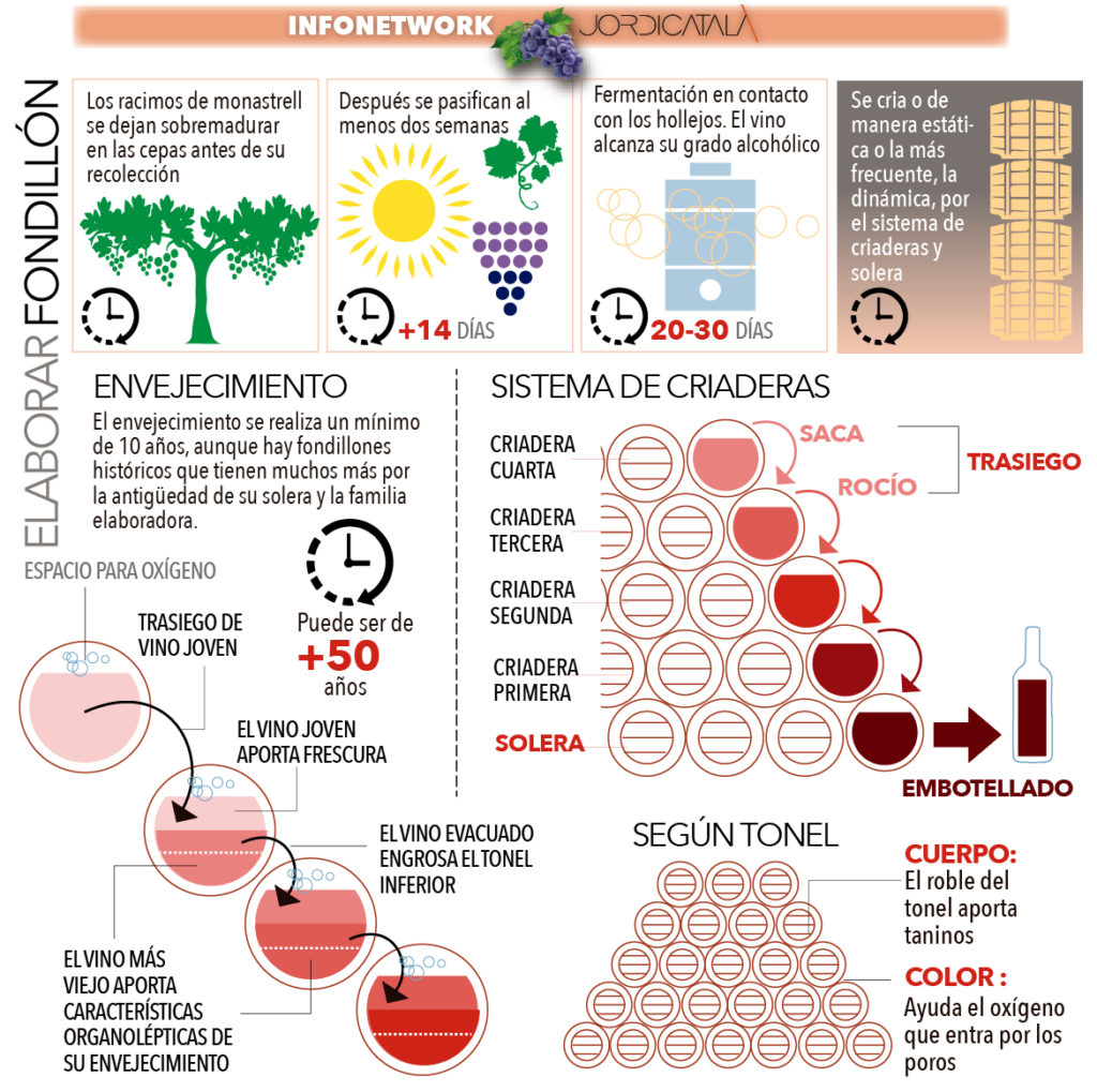 Para elaborar el fondillón se dejan sobremadurar las uvas en la viña y luego se pasifican durante un par de semanas. En la fermentación, el hollejo está en contacto entre veinte y treinta días. Después se introduce el vino en grandes toneles de roble, de más de 500 litros (la barrica típica es de 1500 litros). Y aunque existe una crianza estática del fondillón, lo normal es el sistema tradicional de ‘criaderas y soleras’ (como en Jerez). La crianza ha de ser de más de 10 años.