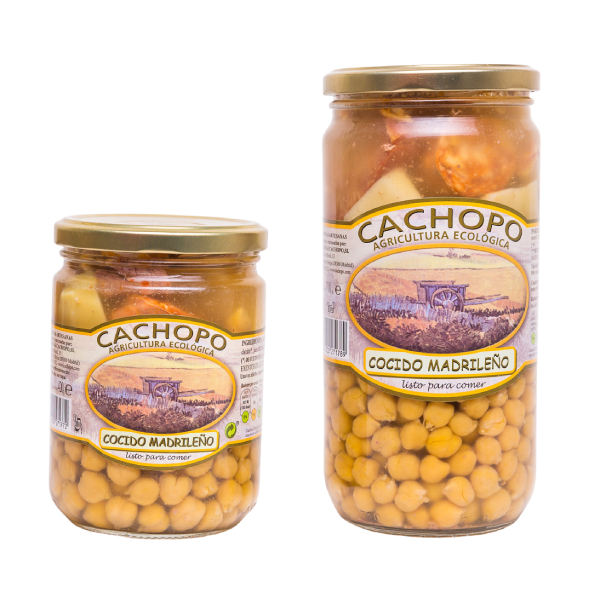 Óptimas sus alubias, lentejas y garbanzos estofados, la olla de judías, el pisto de calabacín y el manchego, así como las conservas de tomate frito ecológico con y sin cebolla, entre otras substanciosas propuestas. Pero si tuviéramos que quedarnos con una de sus conservas, no dudaríamos ni un momento en elegir el cocido madrileño, pues es una receta que aúna todas las buenas artes que ha atesorado a lo largo de los años Conservas Cachopo.