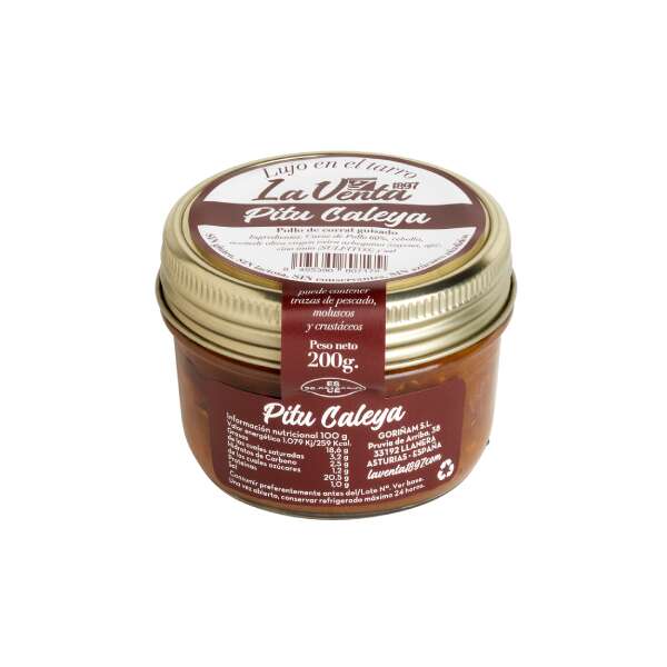 Es una de las conservas de La Venta 1897 más demandadas y su ingrediente principal es el pitu caleya, un pollo autóctono de Asturias de más de un año de edad, que se cría en semilibertad, y que suele pasearse habitualmente por caminos rurales (caleyas). Es un ave que se alimenta principalmente de maíz, hierbas del campo, insectos y semillas, por lo que muestra una carne más oscura, con menos grasa y mucho más gelatinosa que el pollo común. Además, su sabor es más intenso y profundo.